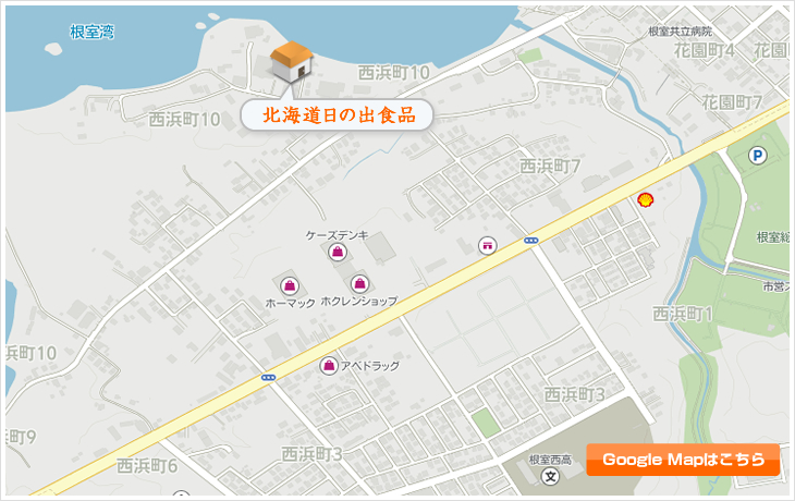| 所在地 | 〒087-0025 北海道根室市西浜町10丁目20番地(GoogleMapはこちら) TEL. 0153-23-4933 FAX. 0153-24-5507 |